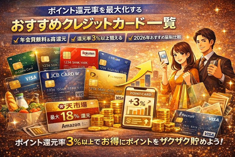 クレジットカードのポイント還元率を最大化すれば、日常の買い物や固定費支払いで数万円相当のポイントを貯められます。この記事では、2026年最新のデータに基づき、年会費無料の高還元カードを中心に、楽天市場やAmazonなどの特定店舗で実質還元率3%以上を狙えるおすすめカードを徹底比較。あなたの利用シーンに合った1枚を選んで、年間10万円以上の節約を実現しましょう。