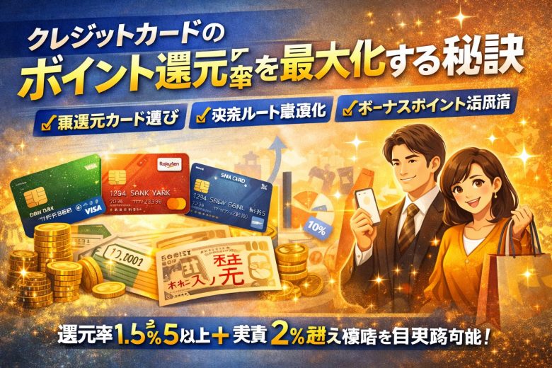 クレジットカードの還元率は、通常還元、ポイントアップ、ボーナス、キャンペーンの組み合わせで決まります。通常還元率は0.5%〜1.2%が主流ですが、特定店舗や利用額達成で最大20%まで跳ね上がるカードが増えています。